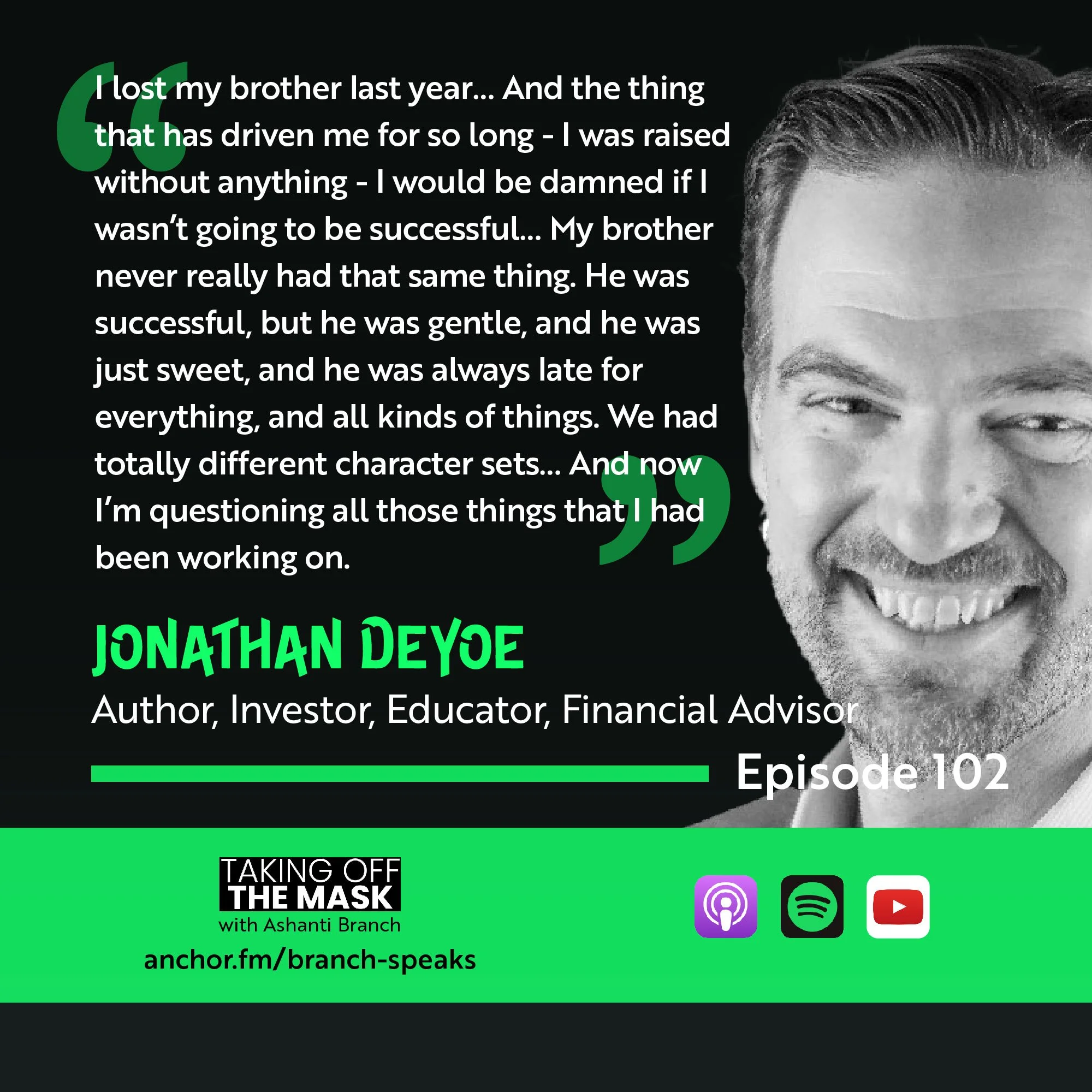 Ever Forward Club’s Ashanti Branch is joined by Jonathan DeYoe. Jonathan is an author, investor, educator, and financial advisor. One of the first things that Jonathan displays to the world is his work ethic. But, importantly, Jonathan also wears his love for his brother on his sleeve. It was really difficult for Jonathan when he lost his brother a little more than a year ago. And it pushed Jonathan to make a simple, yet noble, choice - to openly release his feelings. We’re excited for you to get to know this great father, uncle, and brother.