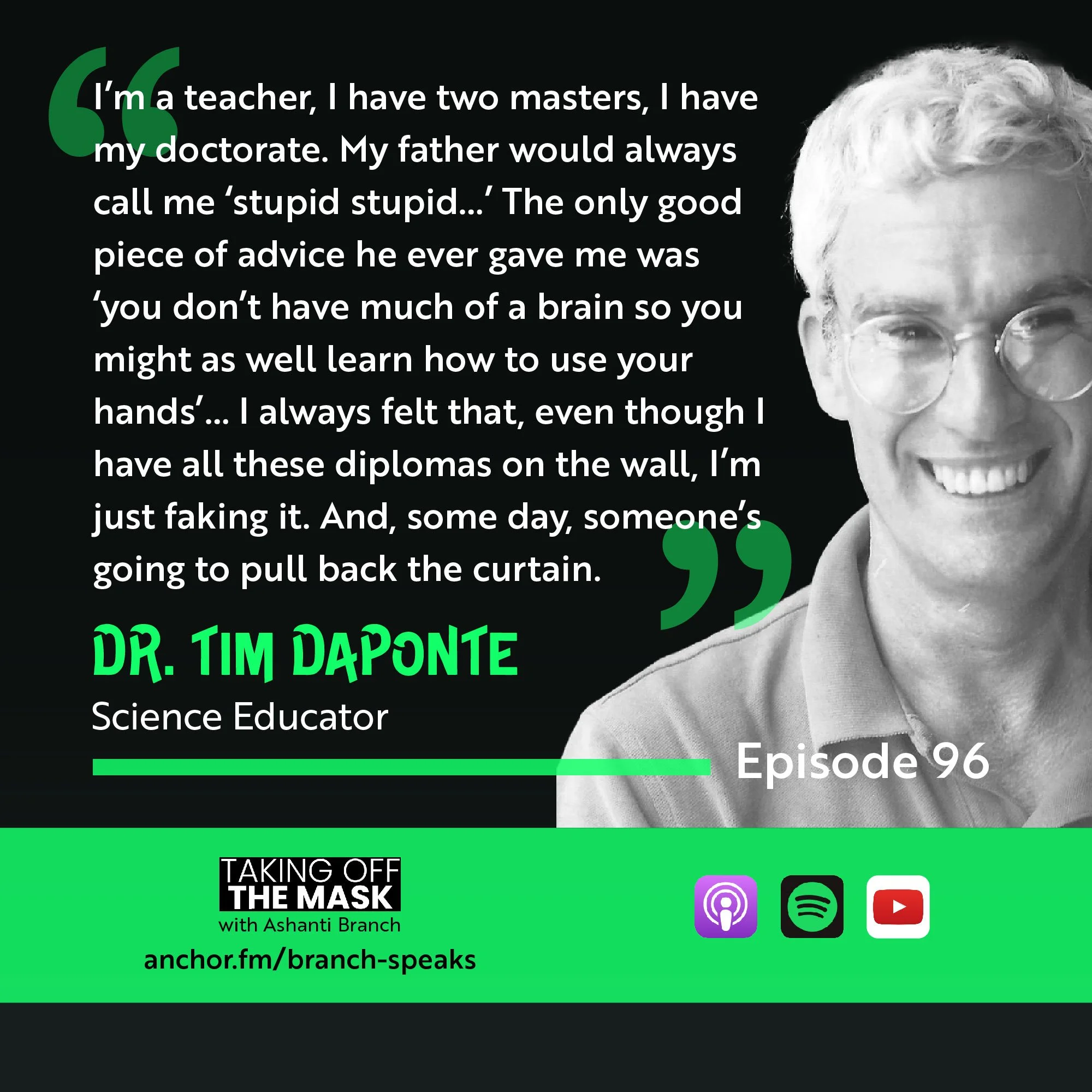 Ever Forward Club’s Ashanti Branch is joined by Dr. Tim Daponte. Dr. Daponte, or Tim, has been a teacher in the state of Texas for over 38 years. One remarkable thing about Tim, in addition to his years of service, is his ability to adapt to the changing characteristics of youth for over three decades - and to remain an outstanding teacher this entire time. After listening to Tim take off his mask with Ashanti, you’ll see why he is able to do what he does.